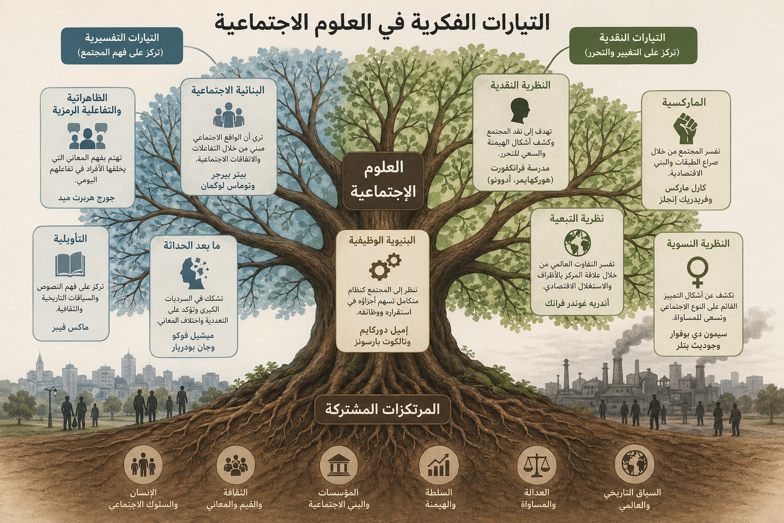يُركز المقرر على تعريف الطلاب بالشخصيات الفكرية البارزة المرتبطة بكل تيار (مثل أوجست كونت، كارل ماركس، إميل دوركهايم، ماكس فيبر، ميشيل فوكو، بيير بورديو، وغيرهم)، وأهم المفاهيم والأطروحات التي قدموها، مع مقارنة أوجه الشبه والاختلاف والنقد الموجه لكل تيار.